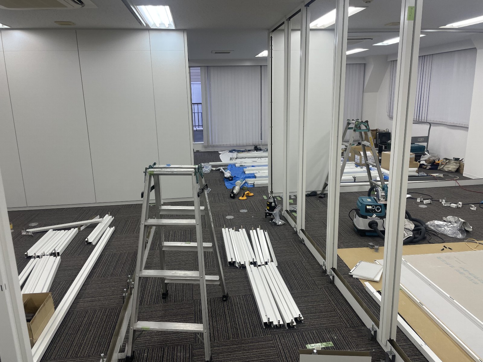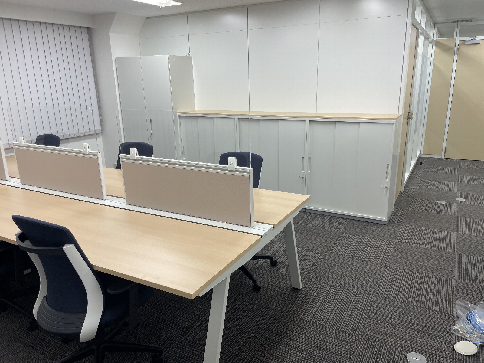 令和4年初に3階事務所フロアを全面リニューアル工事をご注文頂きましたが、業務拡大に伴い、同ビル6階にオフィスを増床され、執務室・会議室・倉庫のレイアウト提案・什器納品・フロア間インフラ工事を承りました2つの会議室にはそれぞれのオンライン会議に対応するWEB会議用システム(acendovibe)を納品設置させていただきました。
