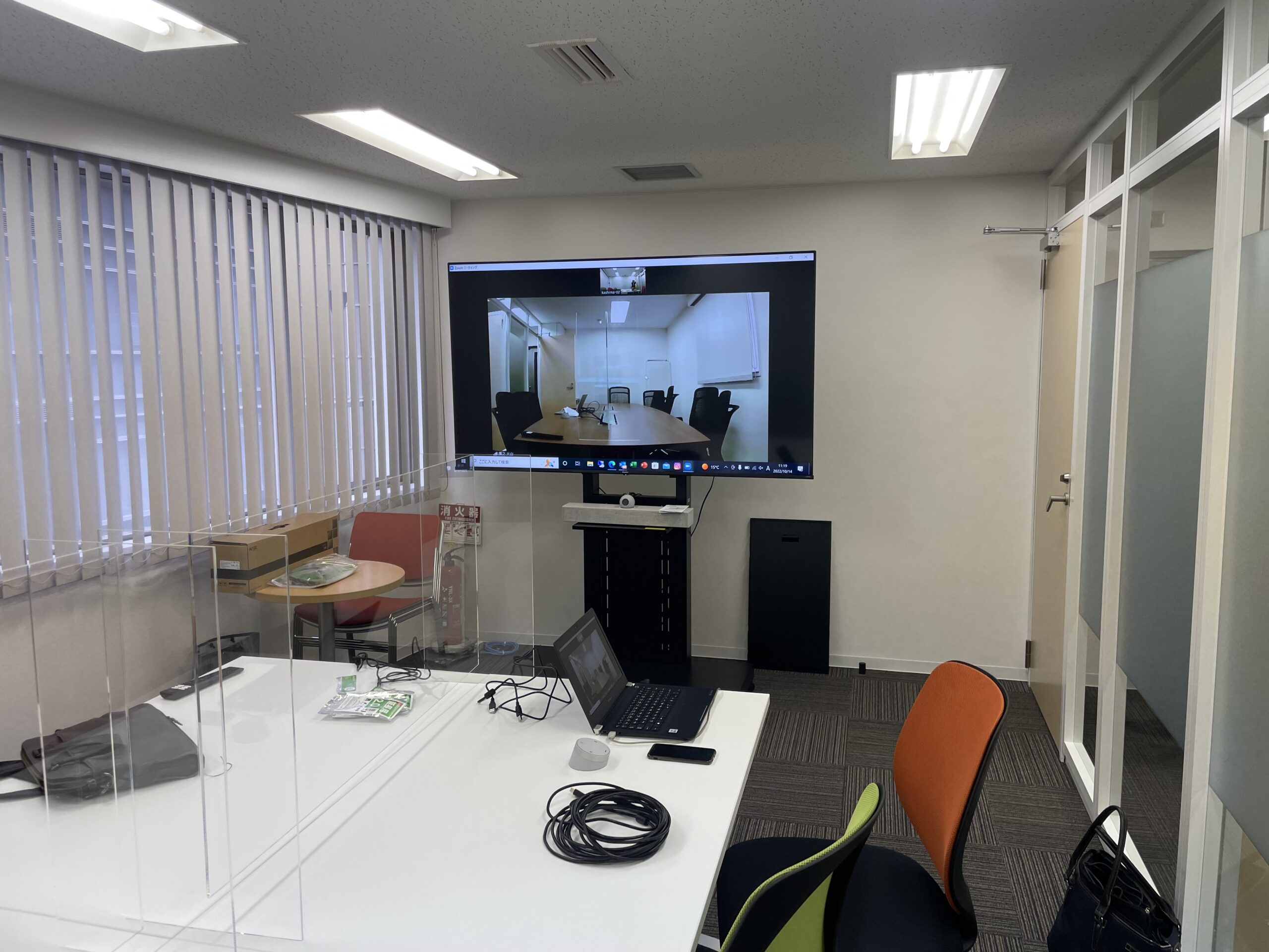 2つの会議室に、それぞれWEB会議システム「AcendoVibe」を設置しました。応接会議室にはパーテション壁面に65インチ液晶TVを設置し、真下に小物収納を兼ねた可動ワゴン天板にAcendovibeを設置、研修会議室には可動式大型モニタスタンドに75インチ液晶TVを設置し、スタンド棚にAcendoVibeをせっちしました。双方のカメラがそれぞれのTVに映し出された写真です。