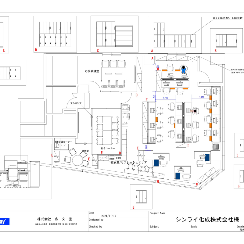 - * レイアウトに関するご希望のヒアリングと実測値が明確な平面図、配置備品の明確な寸法、数量の 情報が必要です。 また密閉間仕切りが必要な場合は空調、照明の配置がわかる天伏図が必要です。